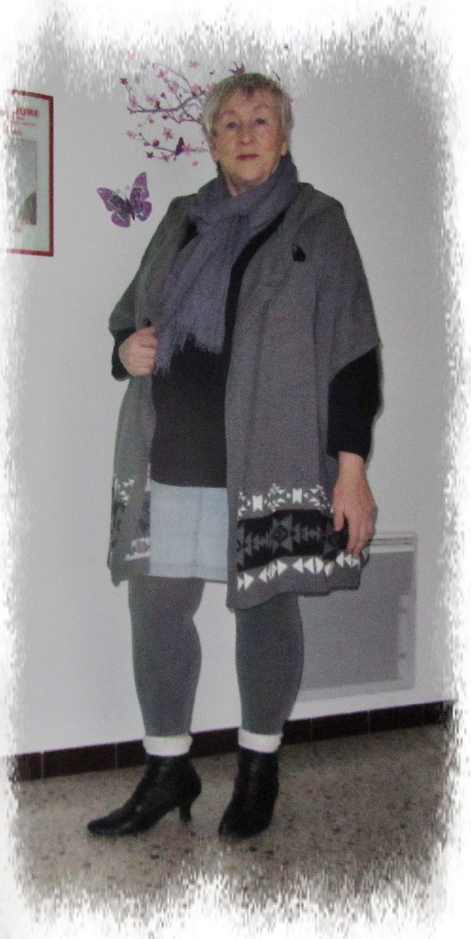 Pour sortir j’ai ajouté un foulard gris bleu et un poncho. Remarque, le pull n’étant pas très chaud et le poncho sans manches ce sera limite si grand froid.