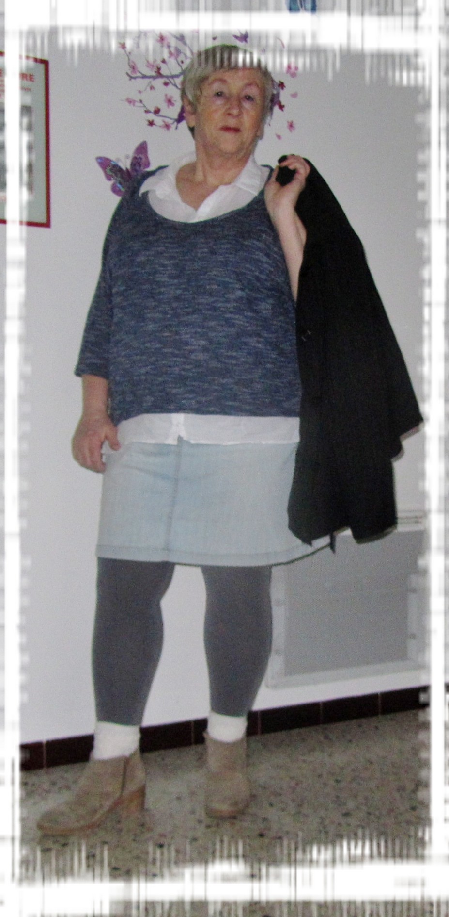 Là vous me voyez avec la jupe en jean sur un leggings gris, des chaussettes écrues retroussées sur les bottillons et un pull noir.