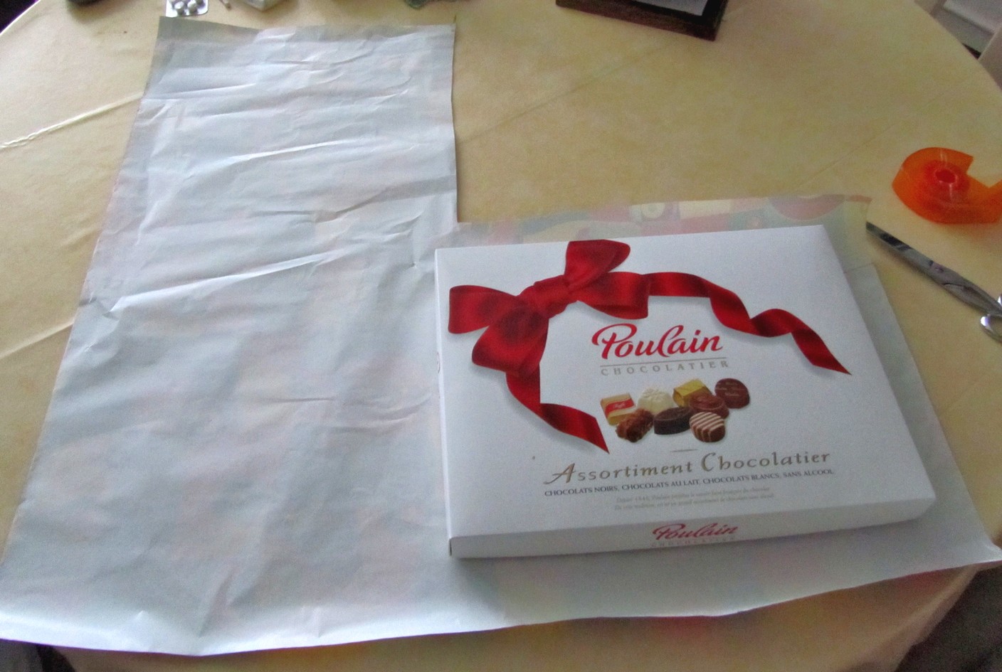 Me voilà avec ce reste de papier qui ne se prête pas à l’emballage. Il en faudrait plus que ça pour me faire peur hein ! Et puis j’ai été emballeuse dans ma jeunesse tout de même.
