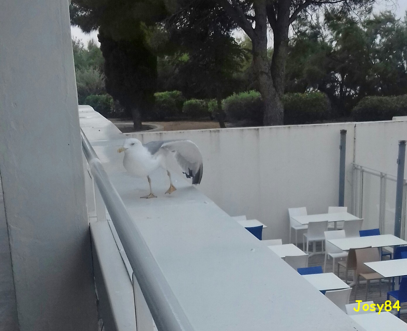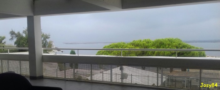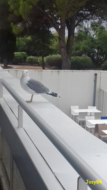 Un matin après mon petit déjeuner je suis montée sur la terrasse supérieure au restaurant et là, tiens une mouette pas effrayée du tout. Je m’approche doucement, elle me regarde …