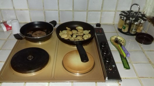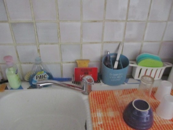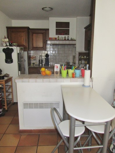 Pas de place pour ma table, pas grave elle est bien là et j’ai tout à portée de main.  J’ai condamné le frigo pour y mettre le mien plus pratique, mais l’autre me sert à ranger des ustensiles  😉