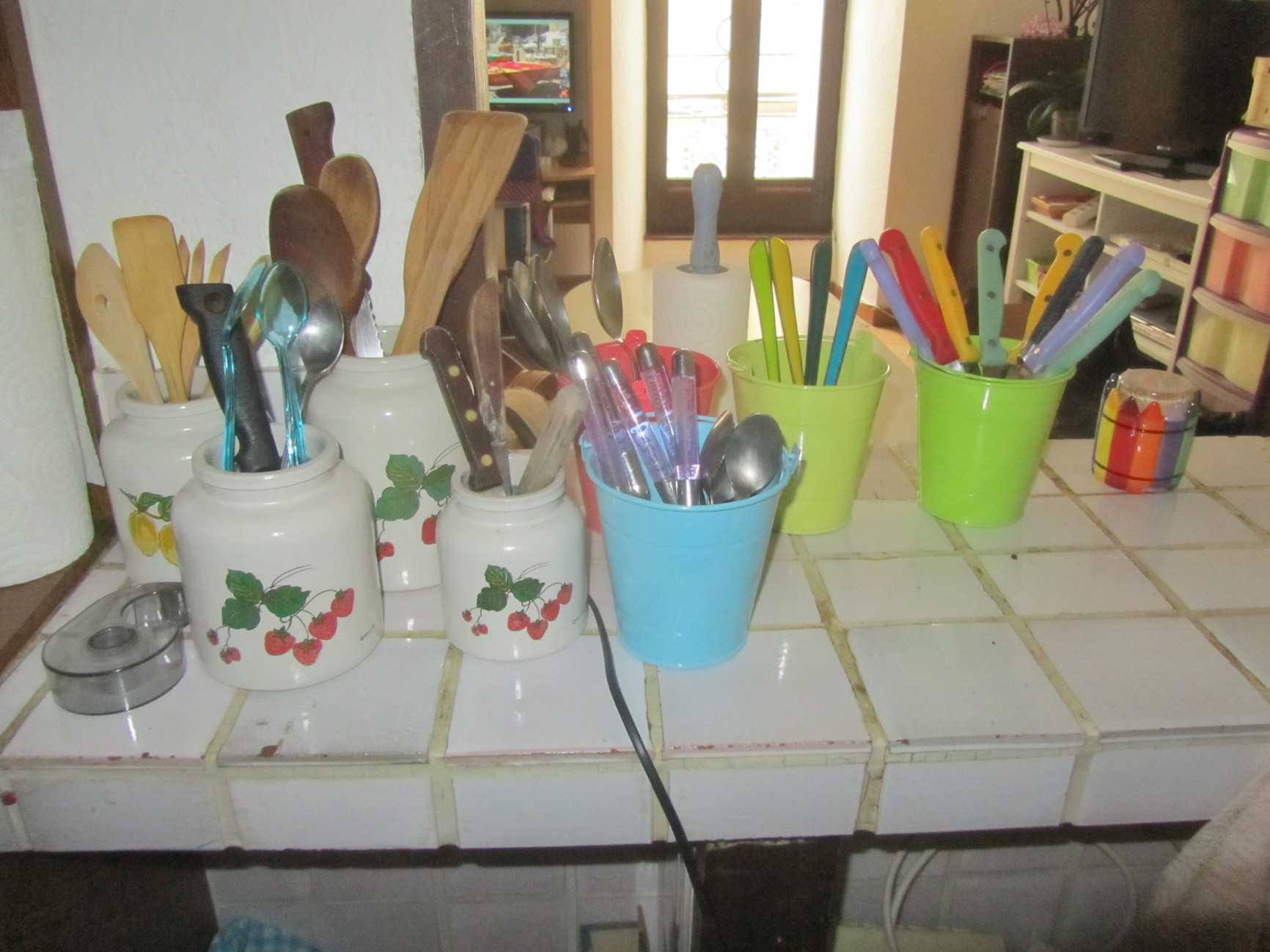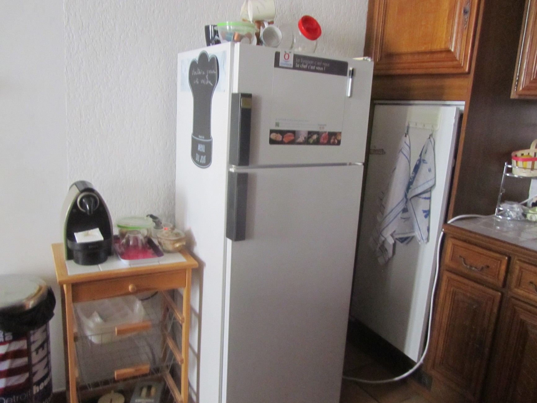 Pas de place pour ma table, pas grave elle est bien là et j’ai tout à portée de main.  J’ai condamné le frigo pour y mettre le mien plus pratique, mais l’autre me sert à ranger des ustensiles  😉