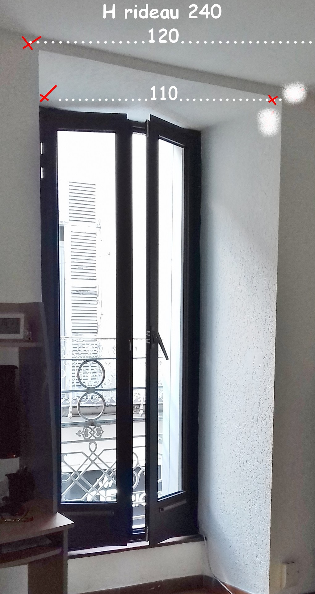 Mais vous voyez elles sont dans un renfoncement ce qui fait que j’ai 2 solutions, ou pas, fixer la barre à l’intérieur en laissant l’espace pour ouvrir la fenêtre, avec une barre de 110 (mais ça n’existe pas) ou plus haut devant avec une barre de 120 (qui ne se fait non plus) j’ai donc du acheter du 150. Mes rideaux étant en 240 ça touchera le sol.