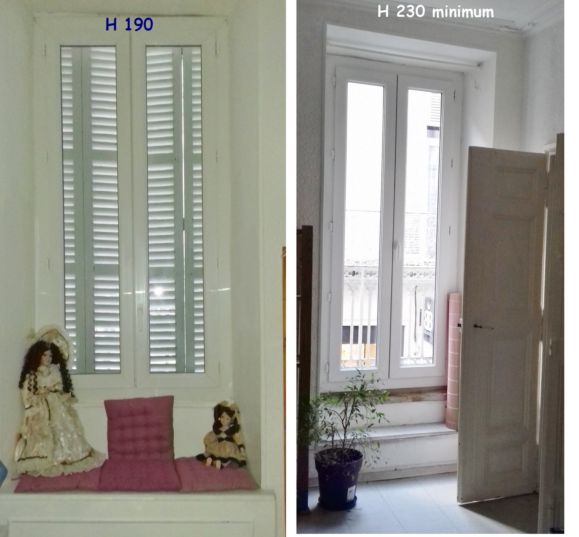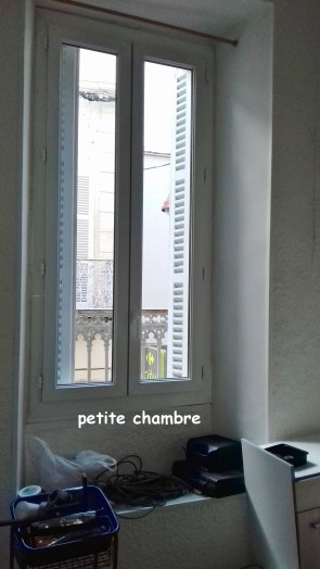 Sur la photo de droite vous voyez qu’il y a une barre déjà mais par contre pas de volet, allez savoir pourquoi. Et elle donne juste en face de ma chambre, ce qui fait qu’on pourrait me voir en sortir en petite tenue hein ! Donc il est urgent d’y mettre un double rideau. Là par contre je n’ai rien dans cette hauteur. Je trouverais une solution…