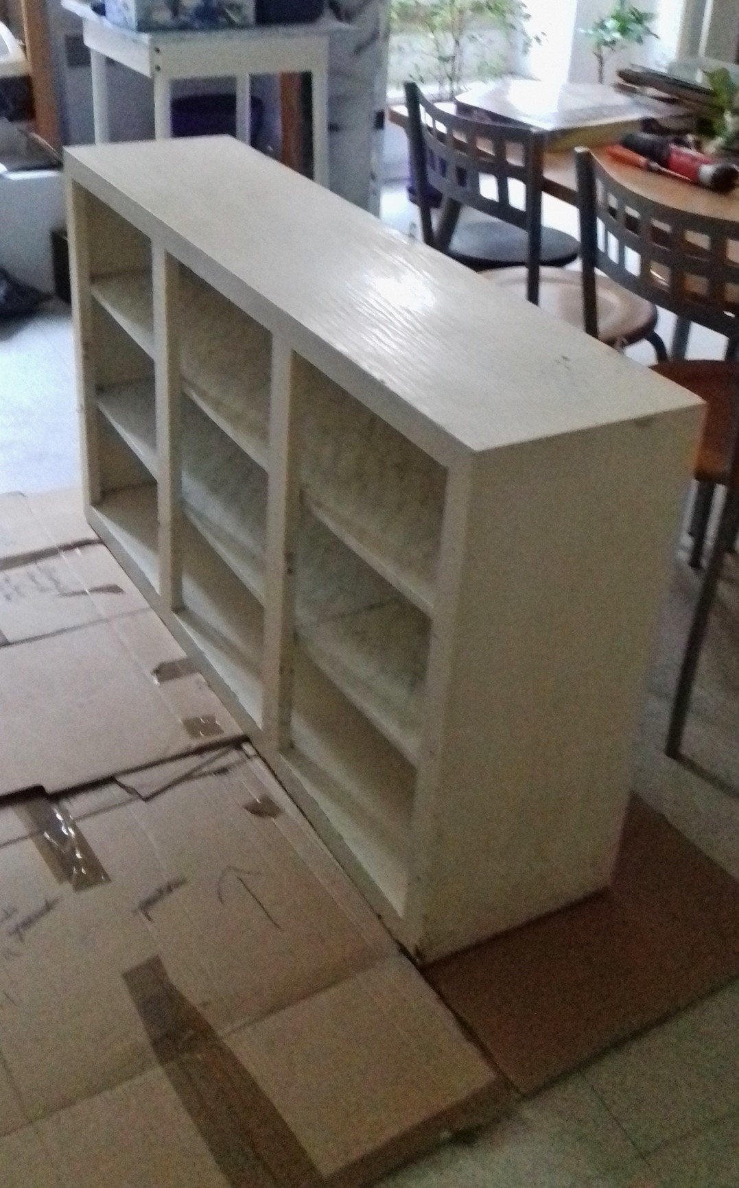 Et je peux dire qu’il a été très vite rempli ! Quand j’ai à nouveau déménagé, 4ans 1/2 plus tard c’est à la cave qu’il a atterri. Là encore il était bien rempli. Mais s’est dégradé forcément. A mon récent emménagement, il y a 2 mois, hésitation je le démoli ou … Il a été mis dans l’espace extérieur en attendant mieux.