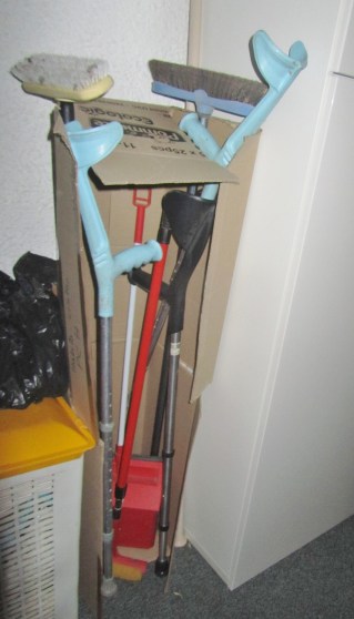 J’avais pensé fabriquer une sorte de placard à balais avec des cartons, mais au bout du rouleau (de scotch marron) et des balais trop grands, voilà le résultat ! On ne se moque pas hein ! J’ai essayé.