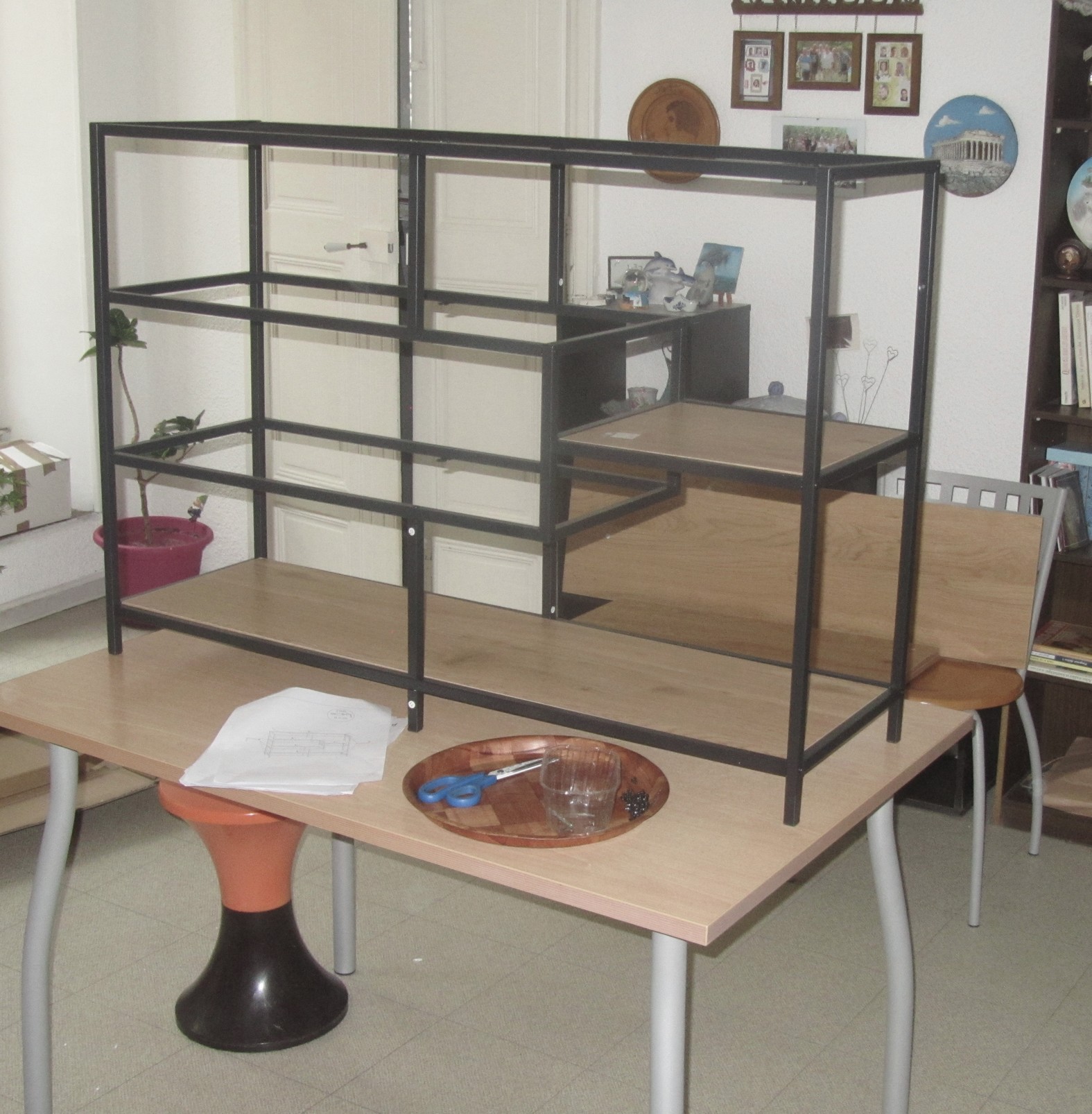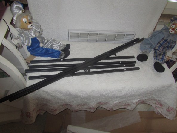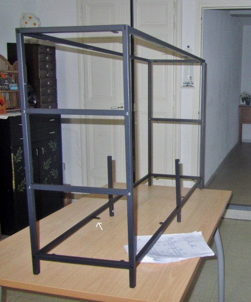 C’est là que je remarque mon erreur, voyez la flèche blanche, j’ai mis ces barres à l’envers, il faut tout démonter ! C’est pourtant bien mis sur la notice ! En effet ces supports sont pour soutenir les étagères.