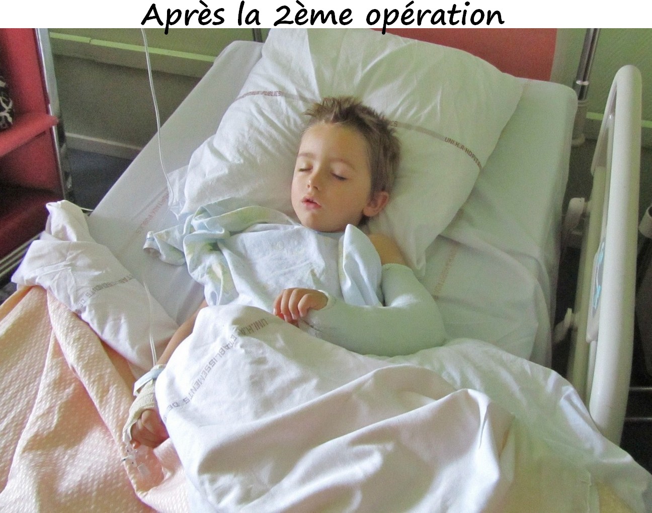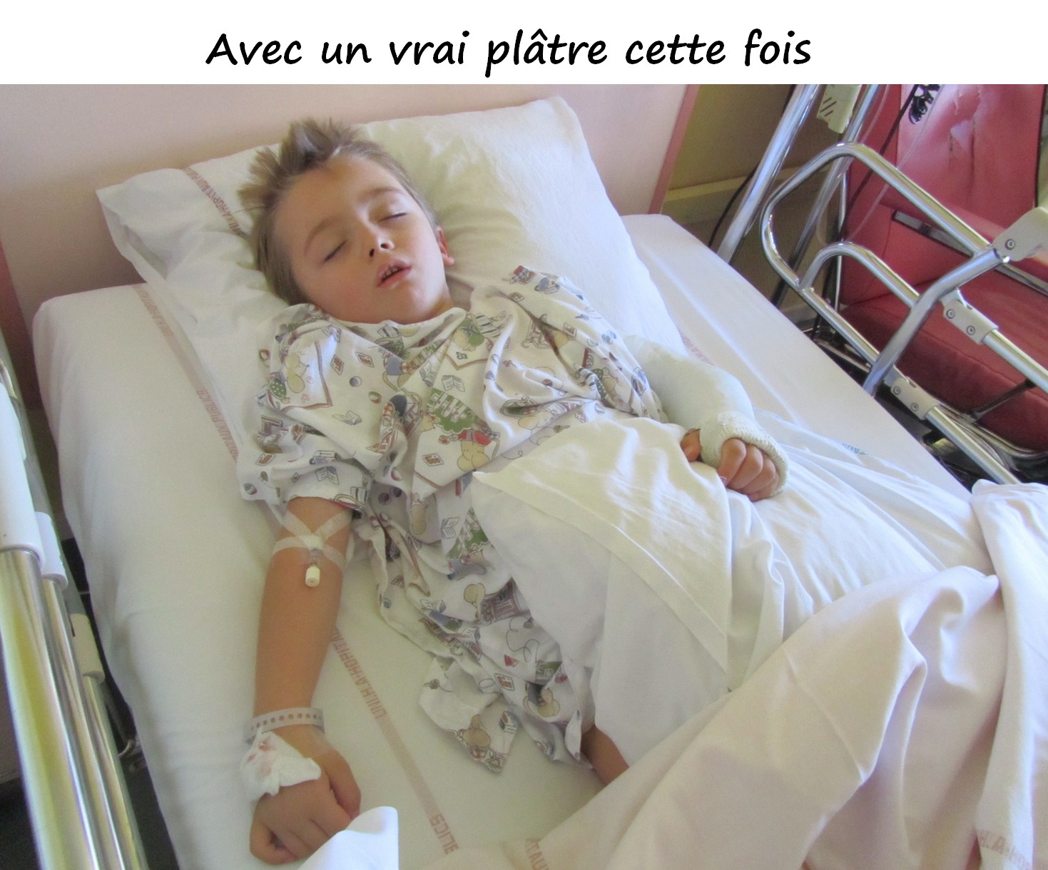 Les nouvelles ne sont pas bonnes. Le chirurgien a fait refaire une 2ème fois la radio qu’il ne trouvait pas très claire, mais son doute a été confirmé, un os a bougé. Lucas est trop jeune à 5ans1/2 pour une broche, alors il va refaire la réduction.