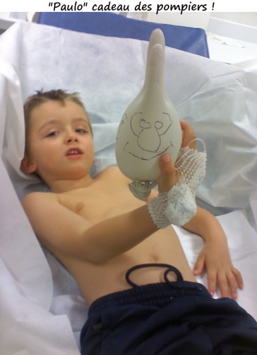 Dans l’ambulance les pompiers ont fait un cadeau à Lucas, un pote nommé Paulo !