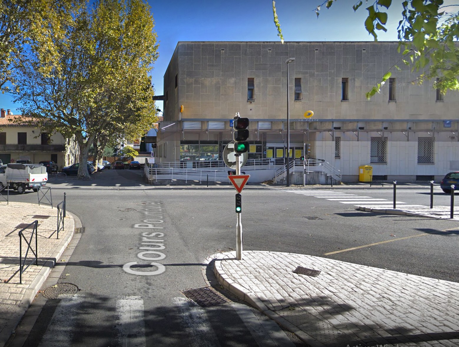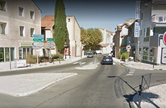 Sur la gauche l’ancien hôpital avec une pancarte apposée sur la grille