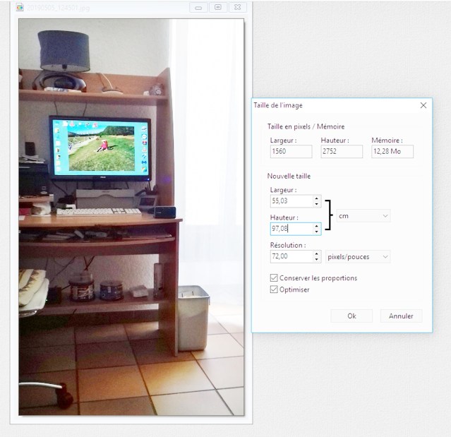 C’est là que j’ouvre mon PhotoFiltre, habituée avec, mais il existe d’autres logiciels de retouche, à vous de voir. J’ouvre le dossier et charge la photo. Un clic droit dessus et « taille de l’image ». Là j’ai mis en cm et 63,01 de haut qui est déjà pas mal. On enregistre. Une fois que toutes vos photos ont été diminuées ainsi on passe à la suite. Astuce pour faire tout d’un coup dans cet article