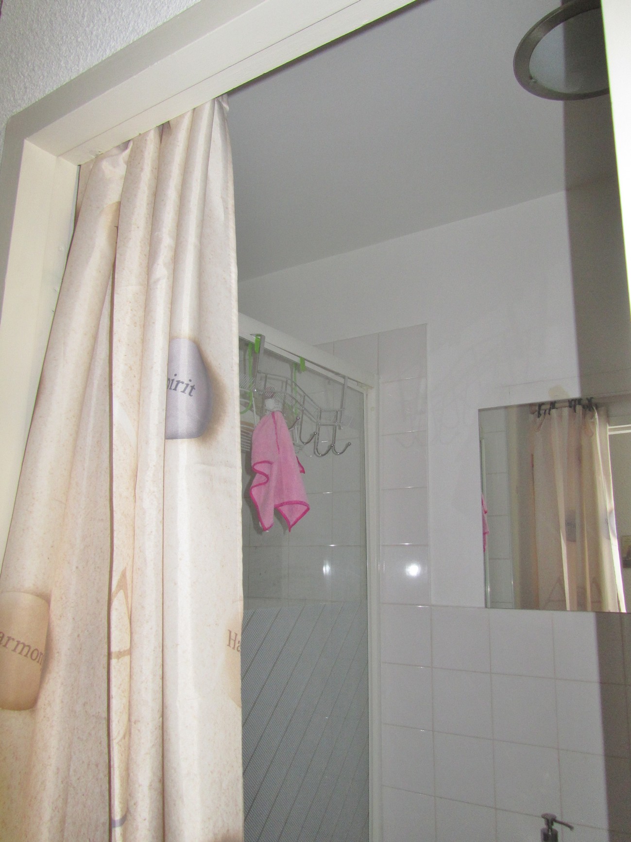 Hop je fais un bond pour arriver à nos jours, bien sur je n’ai pas arrêté de tout changer, la déco est sans cesse modifiée et d’autres choses aussi. Par exemple pour la salle d’eau qui n’a plus de porte, j’avais pensé à mettre mon ancien rideau de douche en dehors mais mette une barre était trop compliqué. Et là j’ai eu une idée …