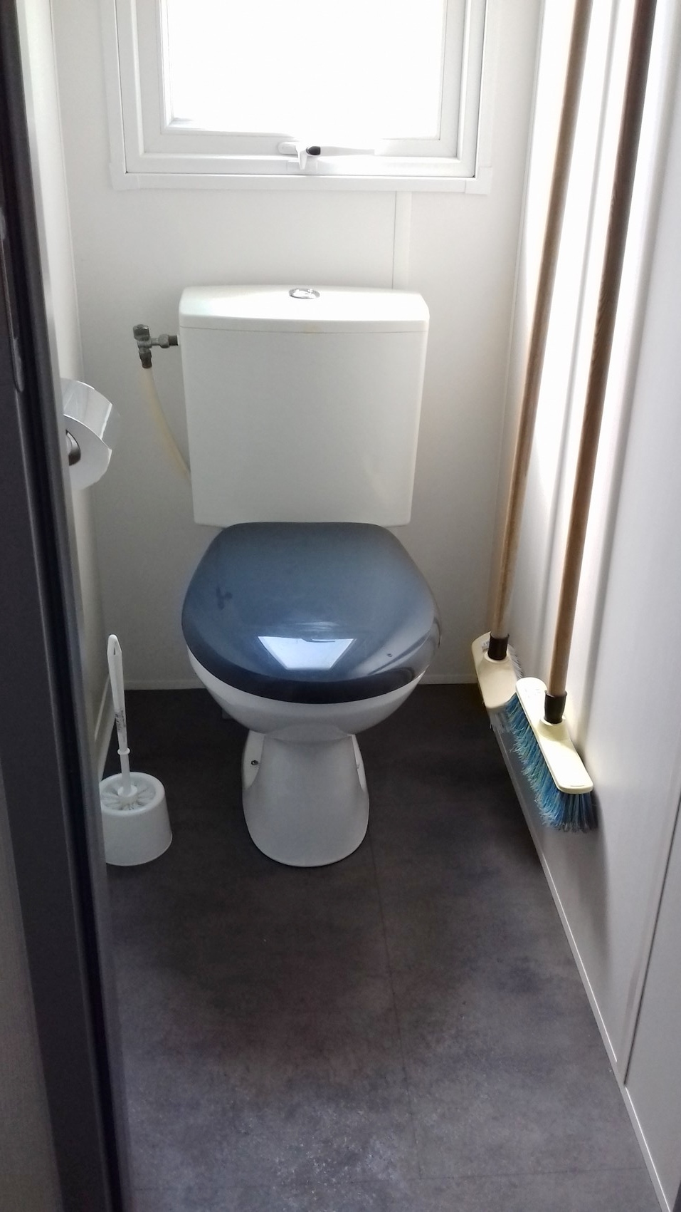 Ça ne se voit pas bien comme ça mais c’est très étroit, au point qu’on se cogne d’un coté sur les balais et de l’autre (et là ça fait mal) sur le dérouleur. Ensuite pour jeter le papier il faut se déboiter l’épaule afin d’arriver derrière soi. Se cognant ainsi de nouveau partout. Autre chose, l’après midi c’était en plein soleil, autant dire qu’on n’y restait pas longtemps !