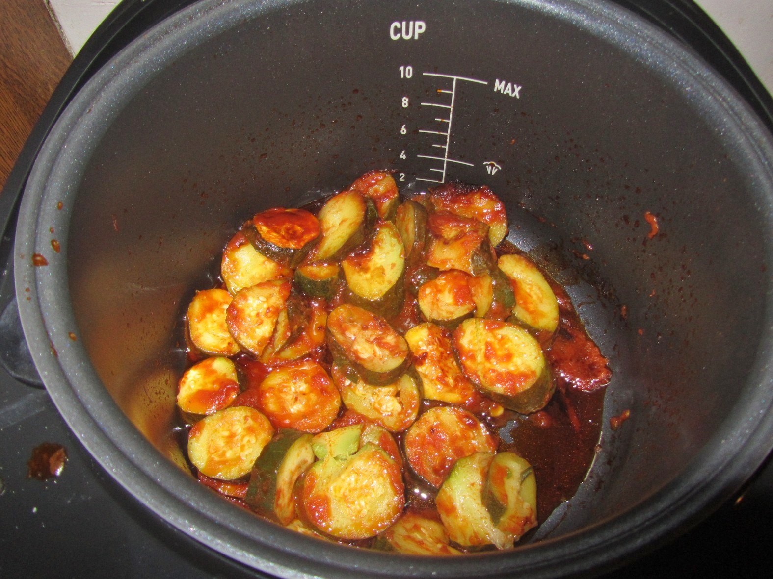 Alors j’ai fait ma 1ère expérience hier avec 3 petites courgettes, un filet d’huile d’olives, du sel de Camargue et de la purée de tomates. Je n’avais que ça