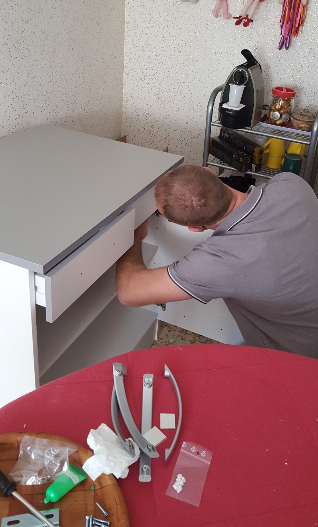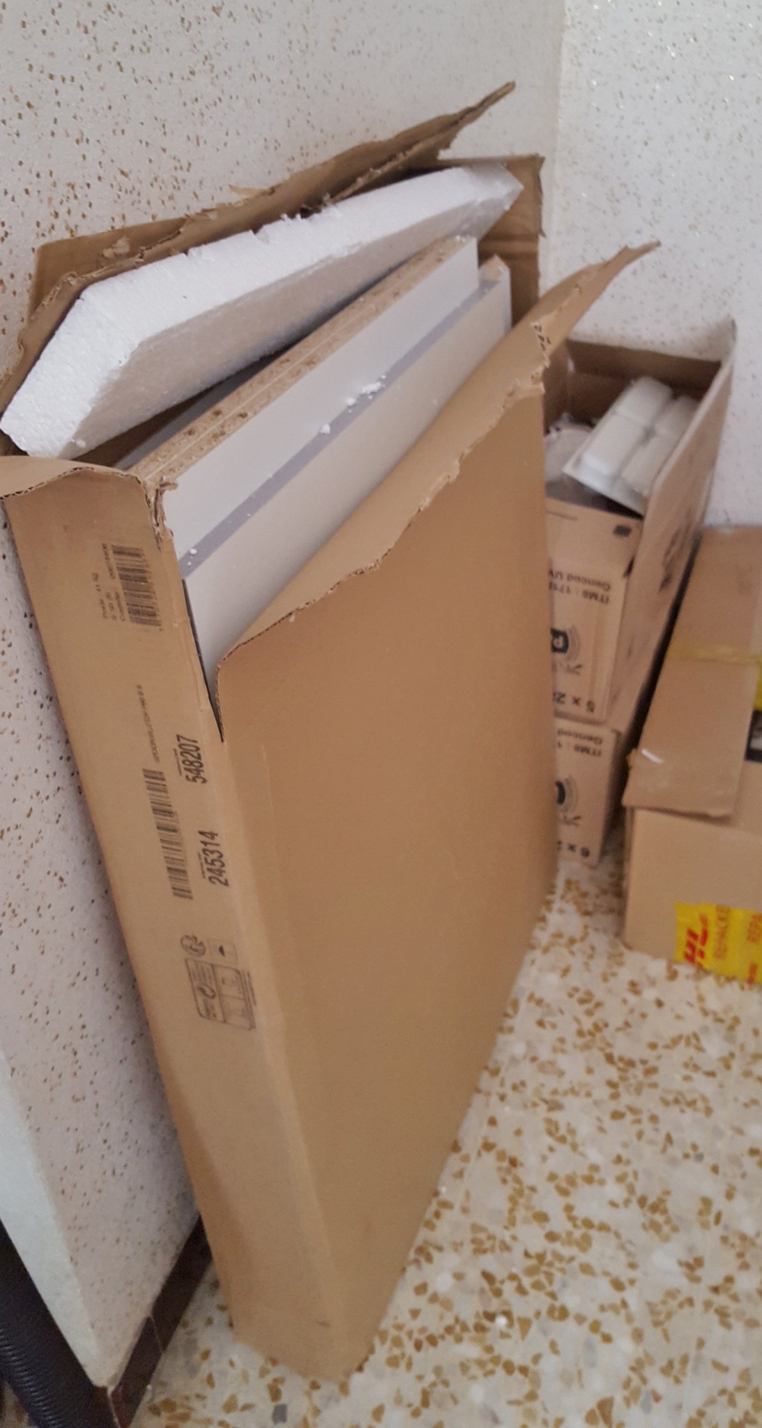 J’avais tout calculé ça devait rentrer … Sauf qu’avec l’interrupteur au bout du mur ça fait 15cm en moins. Et donc la table ne rentre pas. Nouvelle configuration à faire. Le jour J c’est fiston qui a récupéré mon meuble, il bosse à coté. Le soir il m’a apporté ce lourd carton de 40kg, je n’aurais pas pu le porter.