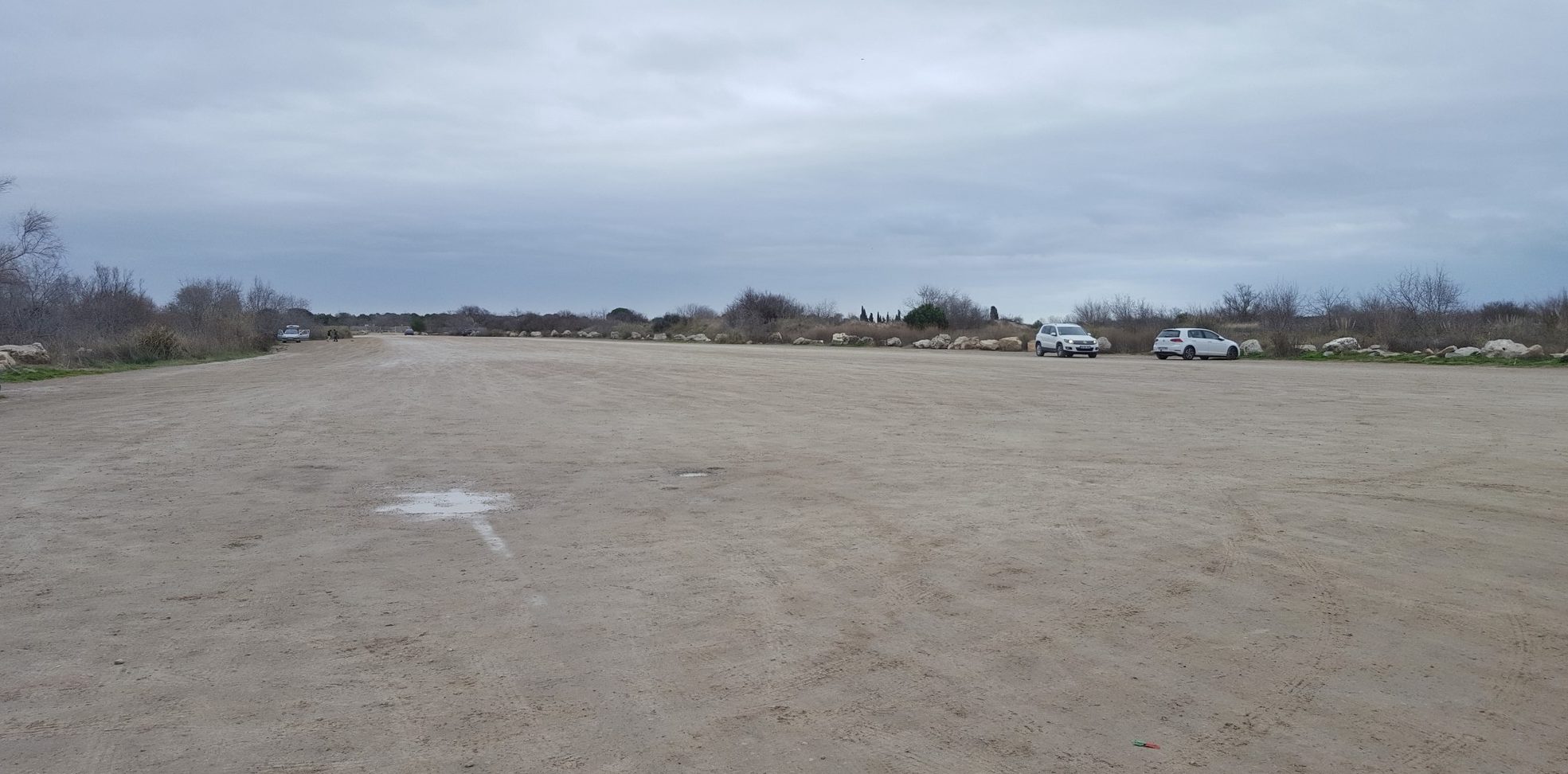Ce parking est plein en été, pour y accéder il vaut mieux avoir un 4×4 ! Sans rire il y a plein de trous tout le long. Là je suis garée à deux pas (de géants) de la plage mais encore très loin de l’eau !