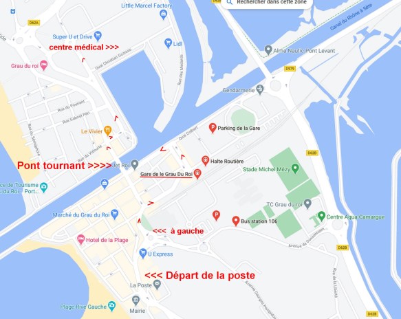 Bonne nouvelle le pont tournant a repris son activité. Du coup je me suis demandée par où il faut passer pour aller à Super u. Mais mes kiné, médecin, labo et pédicure sont là aussi. C’est le quartier « Port de pêche ».