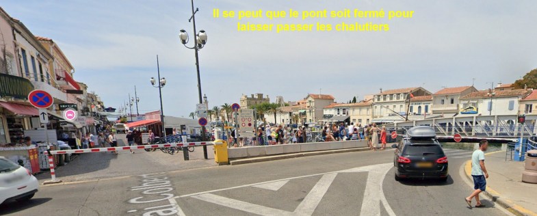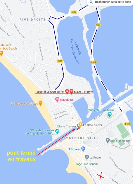 Dans un article j’avais mis l’itinéraire de chez moi à Super U « port de pêche » alors que le pont tournant était fermé pour travaux. Bon ça ne fait que 4km mais c’est un détour quand même. Et cette route est très pénible en été avec l’arrivée des touristes.