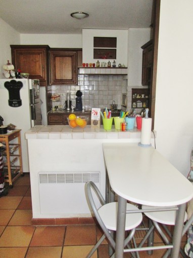 Là je n’ai pas du tout de plan de travail ! Cet appartement servait pour des touristes donc avec le minimum. J’ai acheté le meuble bas que j’avais prévu de mettre contre le mur du fond et la table sur celui de coté mais … Quand j’ai mesuré je n’ai pas pensé au 15cm à coté du frigo pour les prises et interrupteur. Alors il a fallu changer mes plans.