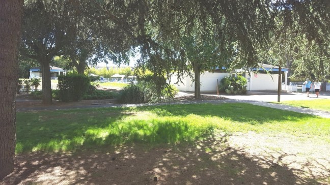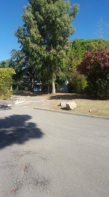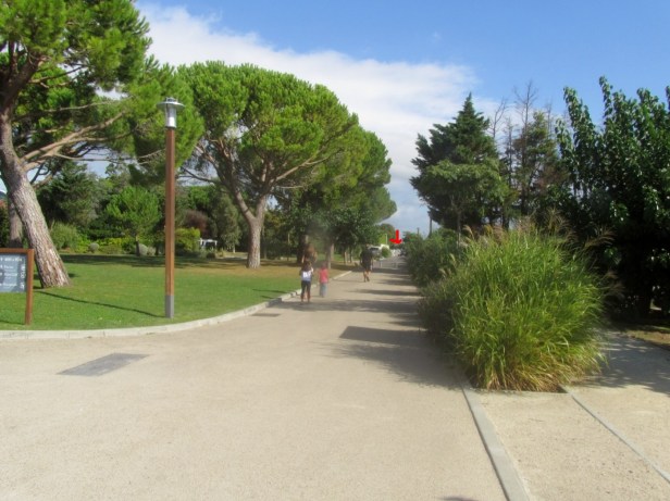 Dans ce cas nous voilà dans l’allée principale, entrée du club au fond. Juste avant les plots on tourne à gauche et on continue le chemin vers la piscine et le golf.