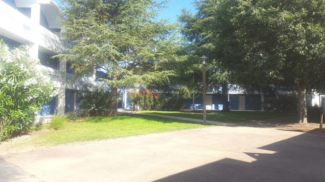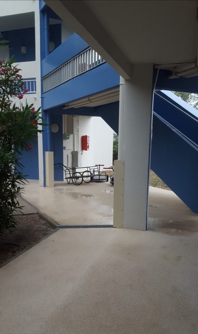 Imaginons que nous sortions du bâtiment d’accueil pour aller vers mon appartement mais en passant par l’intérieur. Pratique un jour d’orage vous verrez.