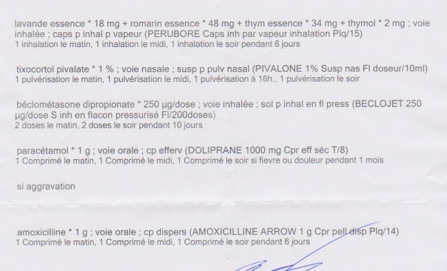 Tout au plus j’ai eu une prescription pour ma sinusite et tout en huiles essentielles ! Même bien trop à mon gout. Avec quand même un antibiotique à la fin.