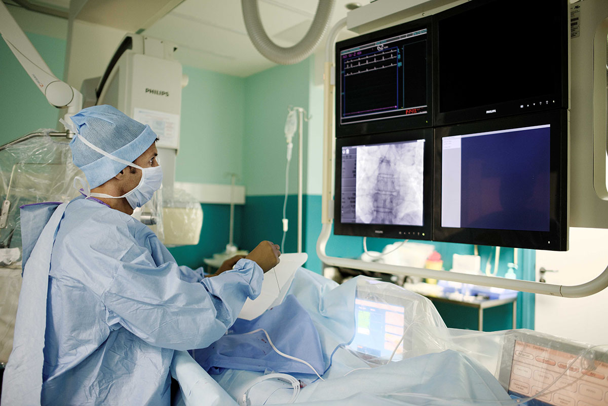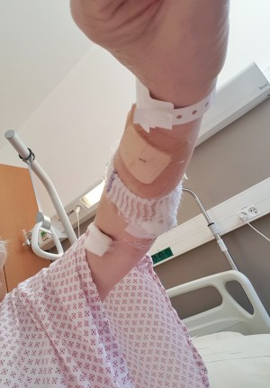 Il était donc 16h45 quand l’examen a commencé, enfin une fois les écrans installés, l’assistant en tenue, le matériel rassemblé et qu’on m’ait attaché les bras. Je déteste ça. Cathéter posé au bras gauche, perfusion en place. J’ai appris plus tard que c’était pour m’hydrater à cause de l’iode. Désinfection de l’avant bras droit et le Dr pique, ouille ça fait mal. Anesthésie locale faite. C’est qu’il faut passer par l’artère du poignet.