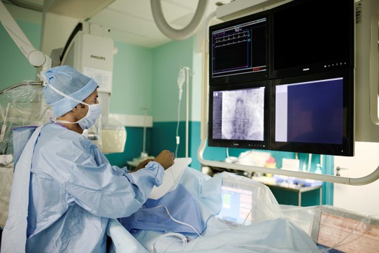 Tout s’est bien passé la coronaire droite débouchée le mois dernier est toujours propre et le stent en place. Une autre a suivi le même traitement. Une autre trop petite suivra le traitement médical.