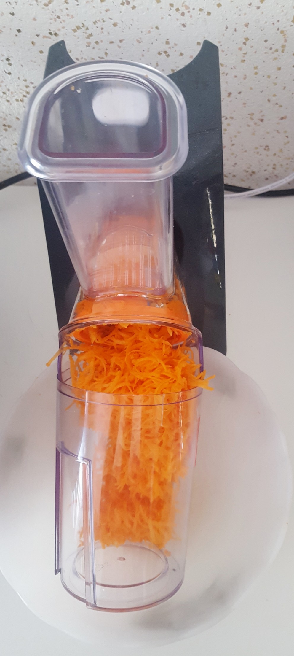 J’avais la même râpe et par exemple quand je râpais du fromage, j’en faisais une bonne quantité pour plusieurs jours. Alors je fixais un sac de congélation au goulot (à l’endroit où les aliments sortent râpés) à l’aide d’un élastique. Comme ça le sac se remplissait directement et j’en avais pas partout ! Je pense que tu peux faire la même chose pour râper des carottes ou autre…