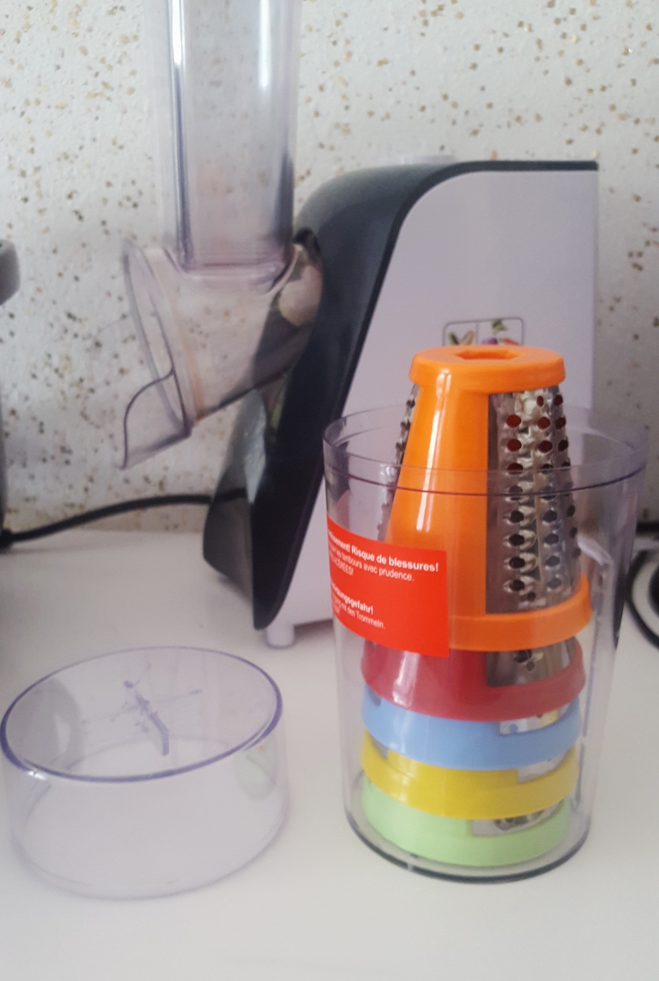 Dernièrement j’ai acheté une râpeuse électrique, voir cet article et comme je disais dommage que ça part dans tous les sens, une fois fini il faut tout nettoyer à coté.