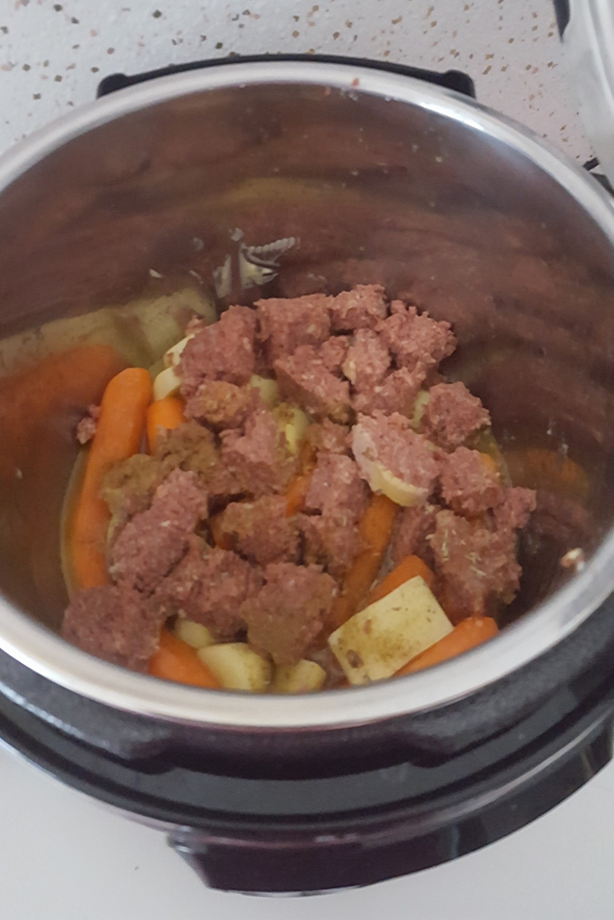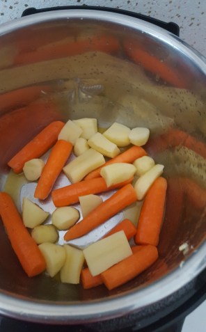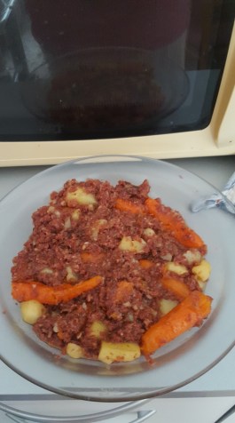 Et j’ai appuyé sur la touche « ragout » qui se lance à 30mn. Mais voilà qu’au bout de 15mn j’ai senti que ça avait accroché au fond, du coup j’ai stoppé la cuisson, ouvert le bidule, ajouté de l’eau en remuant bien le fond pour décoller. Puis vu que les carottes étaient presque cuites quand même j’ai tout fini en 2mn au micro ondes !