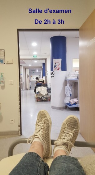 En résumé je suis restée toute habillée, même les chaussures, sur un étroit brancard avec mon sac et ma béquille à coté de moi pendant 12h. Moi qui dors déjà mal dans mon lit à cause des douleurs …