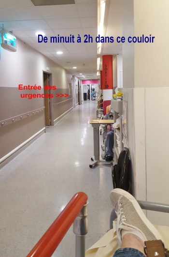 Il devait être environ 23h30 à mon admission, changement de brancard, les pompiers repartent. On me fait un autre ECG puis me dirige dans le long couloir des urgences où je vais rester 2h avec les lumières, les bruit, les cris, le froid et le défilé incessant des brancards.