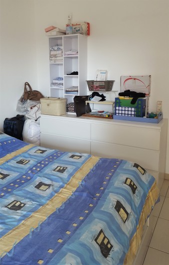 Ce qui me manque le plus c’est une penderie, j’en avais une avant, là mes manteaux sont accrochés sur l’étagère, depuis je les ai mis derrière. J’ai vidé 2 sacs de fringues que j’ai rangées des les casiers à couvercles bien pratiques. Mais quand viendra la chaleur je devrais tout laver.