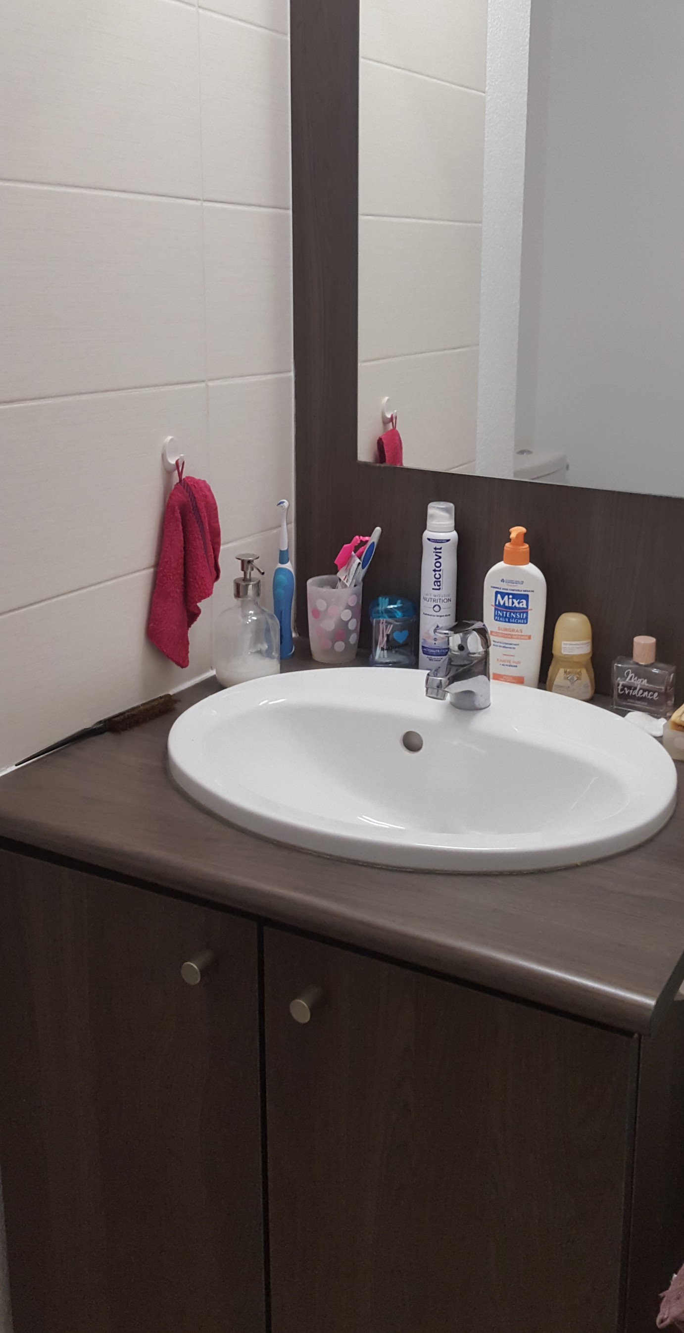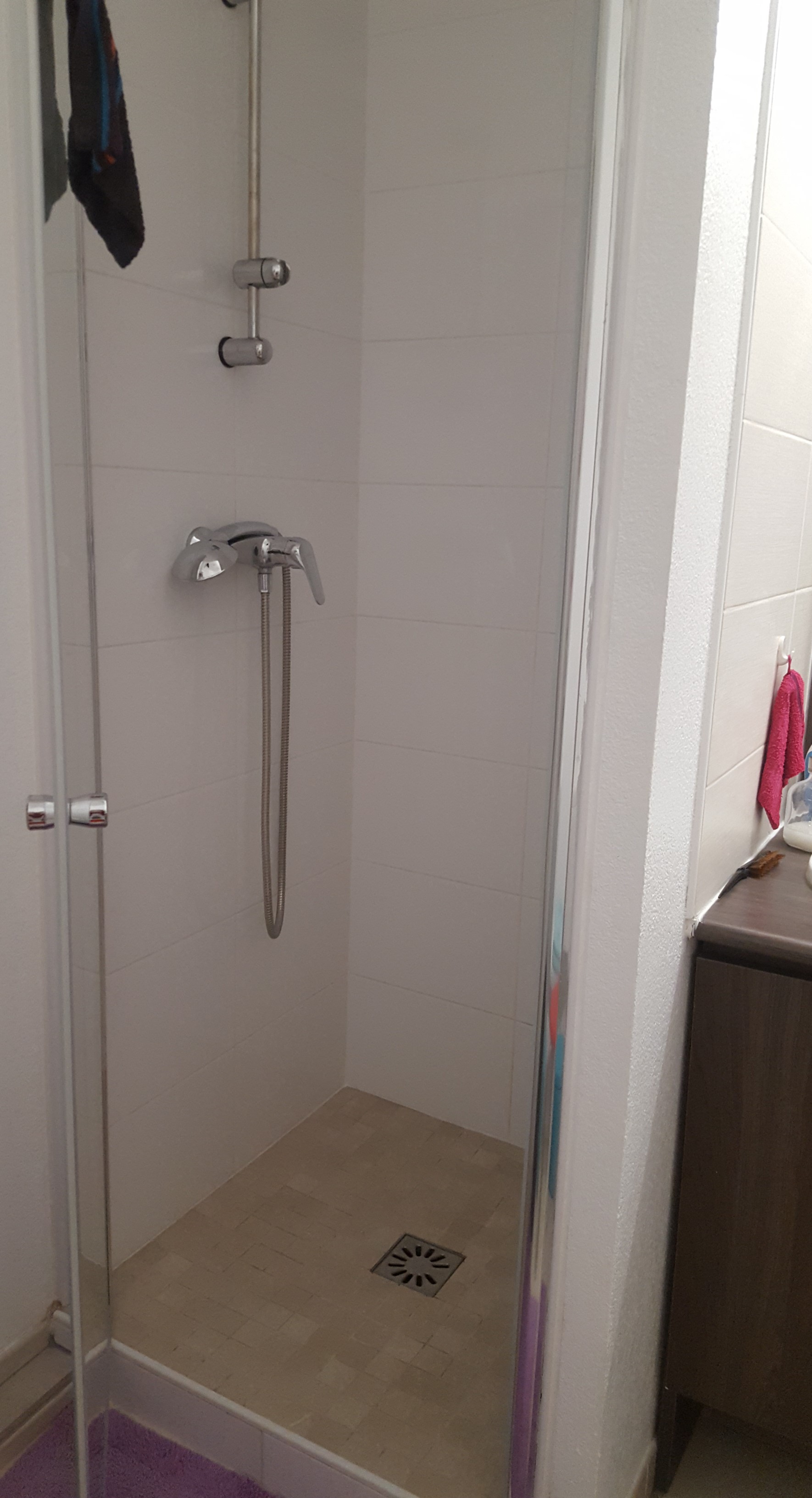 La salle d’eau maintenant, là aussi y a un problème pour moi. Avant j’avais une poignée à ventouses pour m’aider à me lever, mais ici pas de carrelage donc impossible. J’avais mis mon armoire mais trop serrée, autre solution …