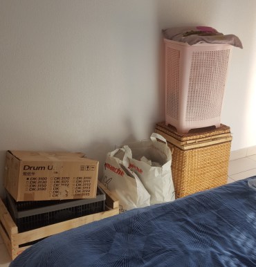 Après m’être débarrassée de la penderie, il a fallu la vider en vitesse et hop tout sur le lit, mais au moins ça fait de la place.