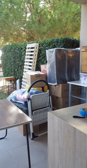 Vous avez pu voir en partie l’extérieur de mon studio puis l’intérieur, on continue ? J’ai une belle terrasse mais le jour « J » j’ai pris peur en voyant les garçons la remplir avec des cartons et d’autres choses. Il fallait commencer par là pour entrer les quelques meubles qui attendaient dans le camion.
