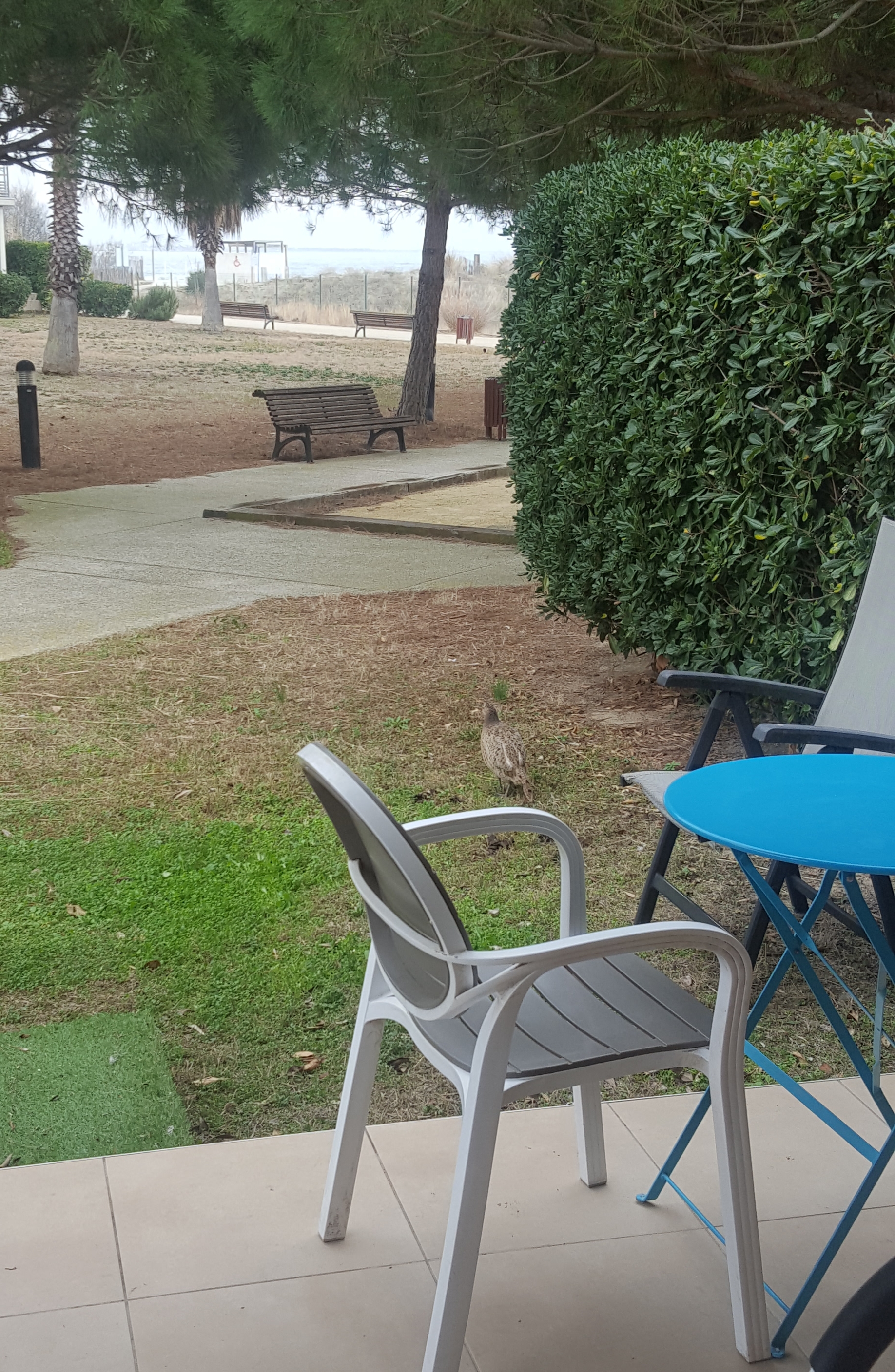 Le point positif pour moi c’est la vue sur la mer ! Et aussi des visiteurs à plumes comme ce faisan, des pies et des moineaux. Et la mer n’est pas loin du tout même à pieds.