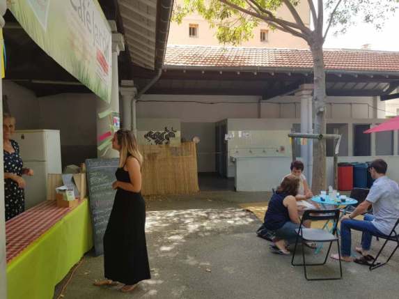 Dès l’entrée on a l’impression d’être dans un autre monde, la paix s’y fait sentir. (Et ce sentiment a été partagé par des comédiens au micro). Il y a des tables, chaises longues, coin lecture, buvette artisanale et le tarif est le votre. J’ai gouté à la violette et la citronnade maison ! Et le tout dans une cour ombragée.