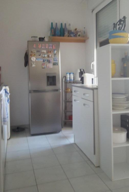 Déjà j’avais déplacé le meuble bas de gauche à droite. Fiston avait mis le frigo en angle rendant inaccessible l’étagère et pas du tout pratique pour le volet !