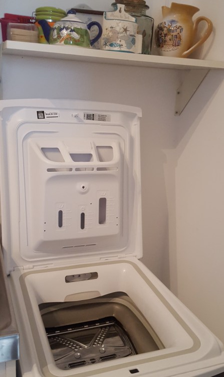 Mon vieux lave linge de 12 ans a rendu l’âme, donc un achat non prévu a été fait. Ce qui veut dire que j’ai du retirer le vieux qui était rentré dans ce coin pour laisser la place au neuf. Et ça toute seule ! Obligée de pousser le frigo et le remettre en place plus tard.