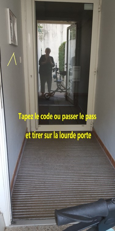 Et toujours d’un bras avec le déambulateur ! Ouf l’ascenseur est à coté pour mon étage. Par contre pour descendre au garage il faut faire le -1 et ouvrir 3 lourdes portes ! Mais vu je n’ai rien à y faire, enfin à part aller chercher mes fringues d’hiver et descendre celles d’été … Là encore j’aurais besoin d’aide bien sur.